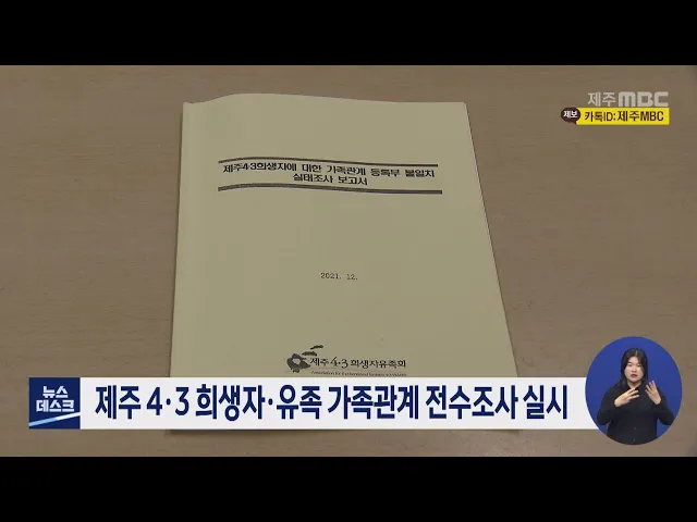 제주 4.3 희생자와 유족 가족관계 전수조사가 실시됩니다. 제주도는 제주 4.3 희생자와 유족 등의 가족관계가 불일치하는 사례를 바로잡고 제도개선을 진행하기 위해 전수조사를 실시한다고 밝혔습니다. 신청 대상은 4.3 희생자의 가족관계 불일치 사례를 알고 있는 사람으로 제주도와 행정시, 읍면동에 의견을 제출할 수 ...