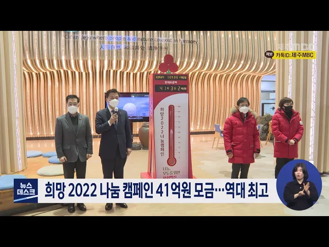 희망 2022 나눔 캠페인 사랑의 온도탑 폐막식이 제주도청에서 열렸습니다. 제주사회복지공동모금회가 지난해 12월부터 62일 동안 진행한 캠페인에서는 역대 최고치인 41억 3천200만 원을 모금했습니다. 지난해 연간 모금액도 105억 천만 원으로 역대 최고치였습니다.