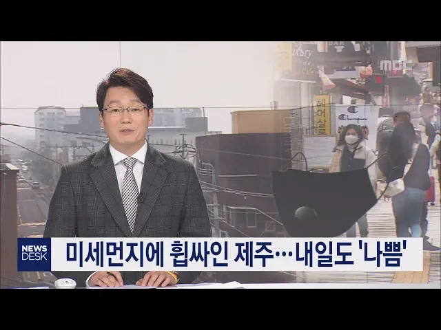 ◀ANC▶ 요즘 미세먼지 때문에 전국이 몸살이죠. 제주도 예외는 아니어서, 미세먼지 주의보까지 발령됐는데요. 당분간 공기질이 좋지 않을 것으로 예상돼 각별한 주의가 필요합니다. 김항섭 기자입니다. ◀END▶ ◀VCR▶ 짙은 안개에 휩싸인듯 도심 한복판이 뿌옇습니다. 지척에 있는 건물 조차 또렷이 보이지 않을 만...