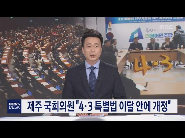 ◀ANC▶ 최근 4.3 생존 수형인들이 무죄판결을 받으면서, 4.3의 완전한 해결을 위해 4.3 특별법도 개정해야 한다는 목소리가 높아지고 있는데요. 제주지역 국회의원들이 이달 안에 특별법이 개정되도록 노력하겠다고 약속했습니다. 김항섭 기자입니다. ◀END▶ ◀INT▶ 지난 2천 17년말 국회에 제출된 4.3 특별법 개정안...