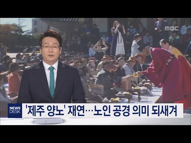 (리포트) 노인의 날 제주양노 행사 재현 ◀ANC▶ 오늘(어제)은 스물 두 번째를 맞는 '노인의 날'인데요. 노인의 날을 맞아 3백년 전 제주목 관아에서 열렸던 경로잔치 행사가 재연됐습니다. 김항섭 기자가 보도합니다. ◀END▶ ◀ANC▶ 제주목사가 잔치에 참석한 어르신에게 술을 올리자, 화려한 옷을 입은 무희들이 나와 장수를 상징하는 복숭아를 올려놓고 아... 김항섭 2018년 10월 02일