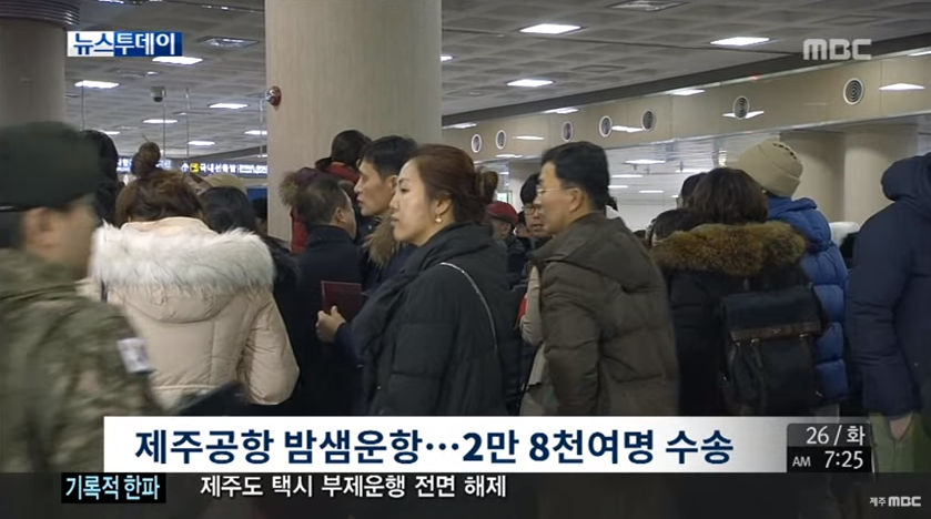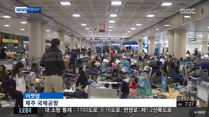 ◀ANC▶ 폭설로 인해 제주도가 삼일 째 고립되면서 제주국제공항이 거대한 노숙장으로 변했습니다. 제주공항의 모습, 김항섭 기자가 취재했습니다. ◀END▶ 공항 출발 대합실 좌석과 바닥에 승객들이 가득합니다. 딱딱한 의자에 앉아 쪽잠을 청하는 사람들도 눈에 띕니다. 공항에서 노숙을 시작 한 사람들의 얼굴에는 피...