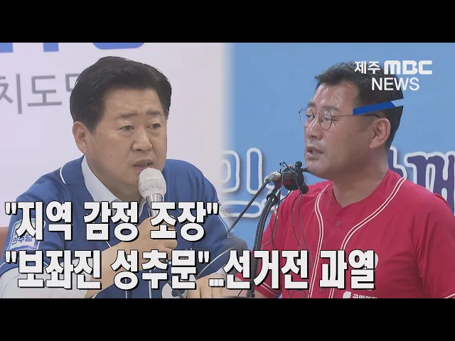 ◀ANC▶ 6.1 지방선거가 9일 앞으로 다가온 가운데, 후보간 선거전이 가열되고 있습니다. 더불어민주당은 제주도가 전라도화 됐다는 국민의힘 제주시을 부상일 후보 발언에 대해 총 공세를 퍼붓고 있고, 국민의힘은 오영훈 후보 보좌진의 성추문 의혹을 제기하고 나섰습니다. 김찬년 기자입니다. ◀END▶ ◀VCR▶ 더불어...