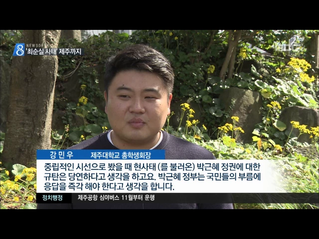 ◀ANC▶ 최순실씨 국정개입 의혹이 확산되면서 제주지역 대학생들이 대통령의 자진사퇴를 거론하며 시국선언을 발표했습니다. 2년 전 석연치않은 이유로 제주 개최가 무산됐던 전국 체전 승마 경기도 정유라씨와 관련된 게 아니냐는 이야기까지 나오고 있습니다. 김찬년 기자입니다. ◀END▶ ◀VCR▶ "자진 사퇴하라 사...