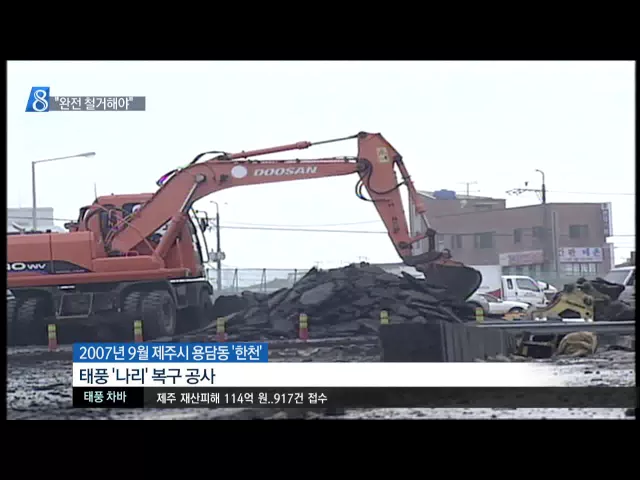 ◀ANC▶ 이번 태풍으로 가장 큰 피해를 본 곳이 하천 위를 콘크리트로 덮어 도로와 주차장으로 쓰고 있는 한천 복개구간인데요. 9년 전 태풍 나리 때도 범람하는 바람에 일부 복개 구간을 철거했지만 별 효과는 없었습니다. 김찬년 기자입니다. ◀END▶ ◀ANC▶ 태풍이 휩쓸고 간 제주시 한천 하류지역 콘크리트로 덮인 ...