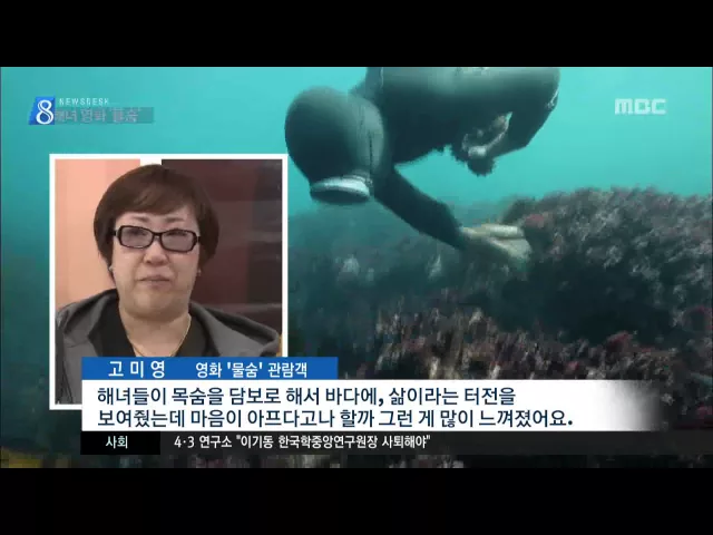 ◀ANC▶ 제주 출신 감독이 7년 동안 해녀들을 촬영해 만든 다큐멘터리 영화 '물숨'이 제주를 비롯한 전국에서 개봉했는데요. 유네스코 인류무형문화유산 등재를 앞두고 해녀들의 삶과 죽음을 담은 영화가 관객들에게 잔잔한 감동을 주고 있습니다. 김찬년 기자와 함께 만나보시죠. ◀END▶ ◀VCR▶ 아무런 장비없이 숨...