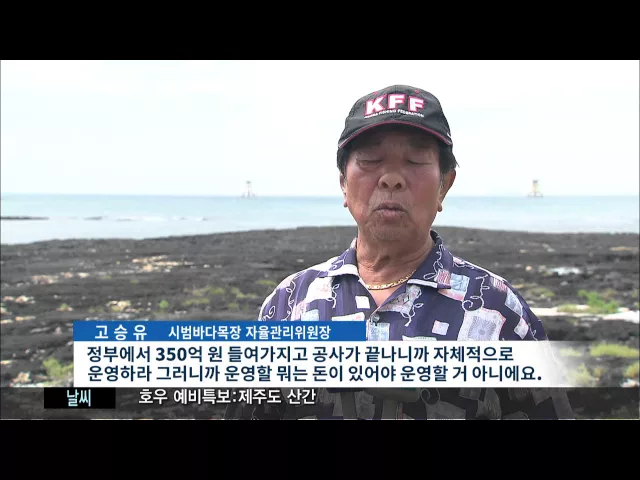 ◀ANC▶ 제주시 한경면 앞바다에 350억 원을 들여 우도 면적의 4배나 되는 바다목장을 2년 전에 조성했는데요, 해양수산부와 제주도가 서로 관리를 떠넘기면서 애물단지로 전락했습니다. 대부분의 시설이 방치되고 있어서 예산만 낭비한 셈입니다. 김찬년 기자가 취재했습니다. ◀END▶ ◀ANC▶ 바다목장 수중 테마공원...
