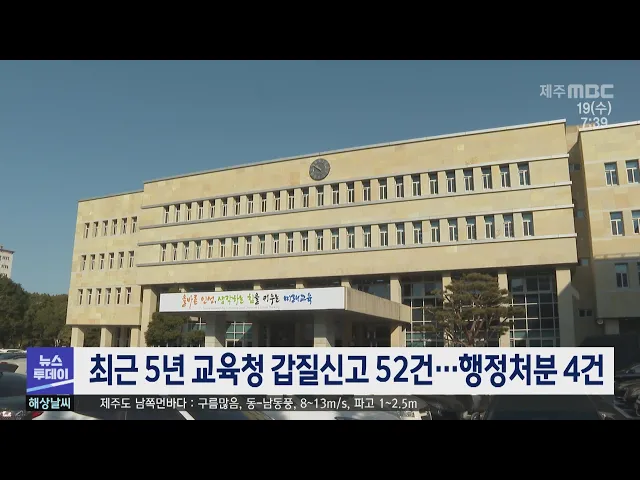 교육청내 갑질신고에 대한 행정처분 수위가 낮은 것으로 나타났습니다. 제주도교육청에 따르면 최근 5년 동안 갑질신고센터에 접수된 신고는 56건으로, 이 가운데 52건이 종결처리됐고 행정지도와 징계는 4건에 그쳤습니다. 더불어민주당 이경심 도의원은 갑질 인정 비율이 낮고 조치가 되는 것은 거의 없다는 것은 신고센...