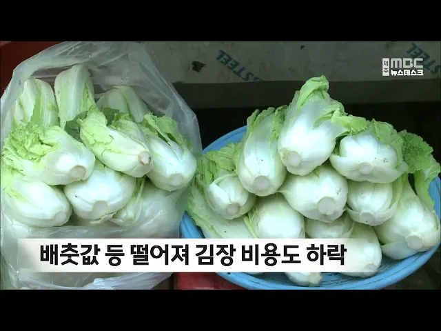 고공행진하던 배춧값이 최근 떨어지면서 김장 비용도 하락할 것으로 보입니다. 한국농수산식품유통공사에 따르면 지난 17일 기준 배추 20포기 김장 비용은 21만 5천 원으로 일주일 전보다 2.9%, 지난해 같은 기간보다 12.2% 하락했습니다. 농수산식품유통공사는 최근 배추와 무, 고춧가루 등의 가격이 하락하고, 쪽파와 액...