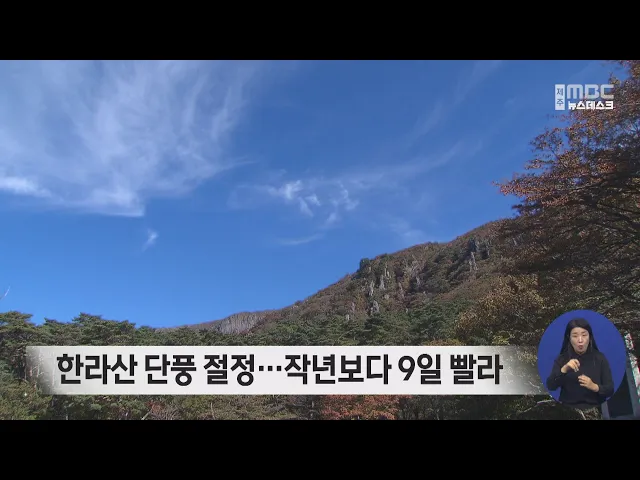 한라산 단풍이 절정을 이루고 있습니다. 제주지방기상청은 지난 18일, 올 가을 한라산 첫 단풍이 관측된 지 6일 만에 절정을 이뤘다고 밝혔습니다. 올해 단풍 절정은 지난해보다 9일, 평년보다는 4일 빠른 것으로, 기상청은 관측 지점인 어리목의 이달 평균기온이 작년보다 4.3도 낮아, 예상보다 일찍 단풍이 절정을 맞았...