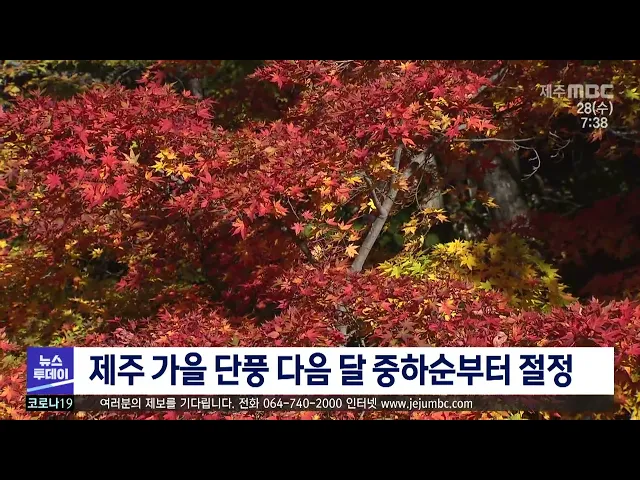 올 가을 제주지역 단풍이 다음 달 중.하순부터 절정에 이룰 것으로 보입니다. 산림청이 발표한 국내 주요 산림 단풍 예측지도에 따르면, 한라산 1100도로의 신갈나무는 다음 달 19일쯤, 당단풍나무는 11월 2일을 전후해 절정을 이룰 전망입니다. 또 한라수목원의 은행나무는 다음 달 28일쯤 절정에 이를 것으로 예측됐습니...