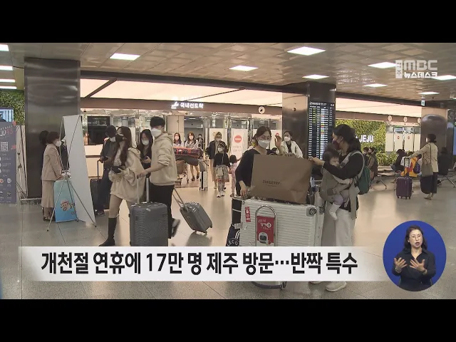 개천절 연휴에 관광객 17만여 명이 제주를 찾을 것으로 보입니다. 제주도관광협회는 내일부터 개천절까지 이어지는 연휴에 하루 평균 4만 3천여 명, 모두 17만 4천여 명이 제주를 찾을 것으로 예상했습니다. 이는 지난해 같은 기간보다 13.2% 늘어난 규모로, 연휴 첫날인 다음달 1일에 가장 많은 4만8천여 명이 방문할 전...