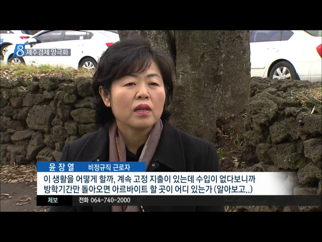 ◀ANC▶ 신년기획, 6번째 순섭니다. 관광산업이 활황세를 이어가고 인구가 늘어나면서 다른 지역의 부러움을 살 정도로 제주는 급속한 경제 성장세를 보이고 있습니다. 하지만 화려한 성장의 이면에는 사회적 양극화의 그늘이 짙게 드리워져 있습니다. 홍수현 기자의 보돕니다. ◀END▶ ◀VCR▶ 학교에서 급식 조리사로 ...
