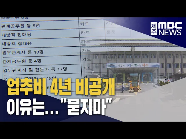 ◀ 앵 커 ▶제주도의 업무추진비 편법 사용 의혹보도 이어갑니다. 쪼개기, 인원수 부풀리기 같은 편법 사용실태 어제 전해드렸는데요. 일부 부서는 조례를 위반해업무추진비 집행내역 자체를공개하지 않은 것으로 확인됐습니다. 이따끔 기자가 보도합니다.◀ 리포트 ▶ 쪼개기 결제와 인원수 부풀리기 등 편법 사용 논란이 제기...