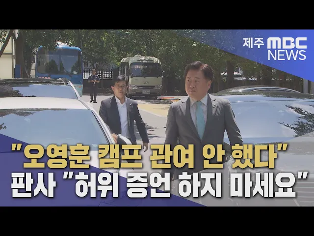 ◀ANC▶ 공직선거법 위반 혐의로 기소된 오영훈 제주도지사에 대한 7차 공판이 오늘(28일) 열렸습니다. 논란의 핵심인 협약식을 주도한 사단법인 대표가 증인으로 출석해 선거캠프 관여를 전면 부인했는데요. 그러나 판사가 증언에 모순이 있다며 거듭 추궁하자 캠프가 협약식에 관여했다는 점을 인정하고 증언을 거부했...