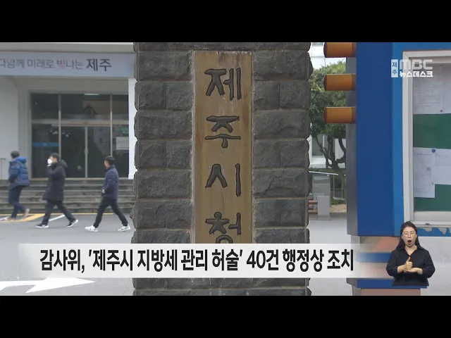 제주시의 지방세 관리가 허술한 것으로 드러났습니다. 제주도감사위원회가 최근 2년 동안 제주시의 행정업무를 감사한 결과 공유재산을 특정인과 수의 계약해 최대 32년까지 빌려준 것으로 확인됐습니다. 또 아동수당과 어선 유류비가 부적정하게 지급되는 등 40여 건의 행정상 조치와 1억 3천만 원의 재정 조치가 내려졌...