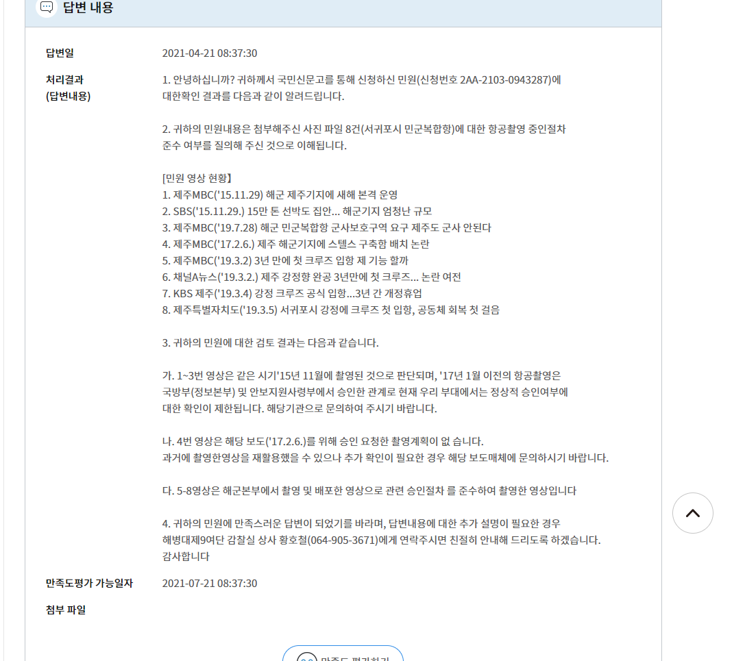 시청자의견 4번 누가 촬영 한건가요? 정식 승인은 받았는지요 등록일 : 2021-10-19 11:31 조회수 : 100 댓글(1) 2021-10-20 16:06 해당영상은 2015년 11월 제주 해군기지 준공식 당시 해군으로부터 제공받은 영상입니다. 참고 부탁드립니다. 수정 삭제 답글 여러분의 의견을 남겨주세요 ※ 댓글 작성시 상대방에 대한 배려와 책임을 담아 깨끗한 댓글 환경에 동참해 주세요. 0/2000 등록 수정 삭제 이전글 다음글 목록